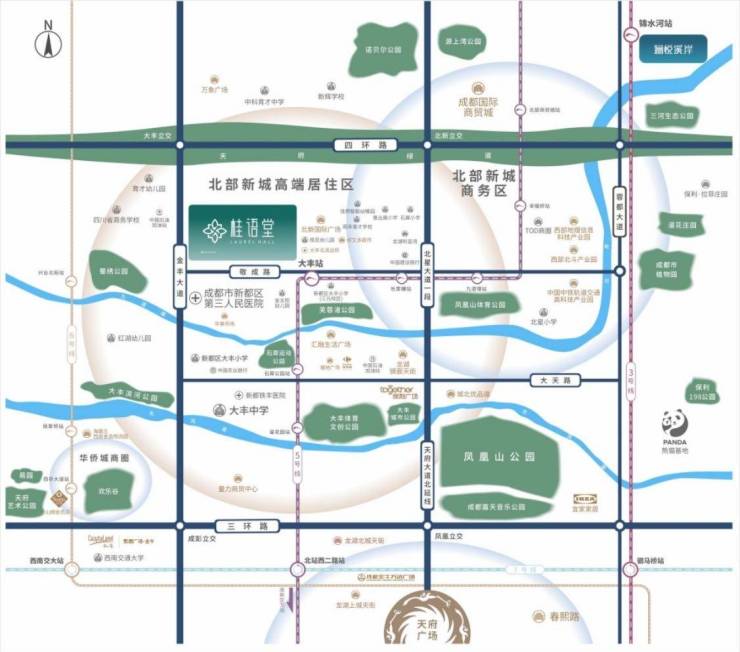 地铁5号线大丰站(800米)+金丰高架+四环路立体交通,快速接驳主城核心区与天府新区。