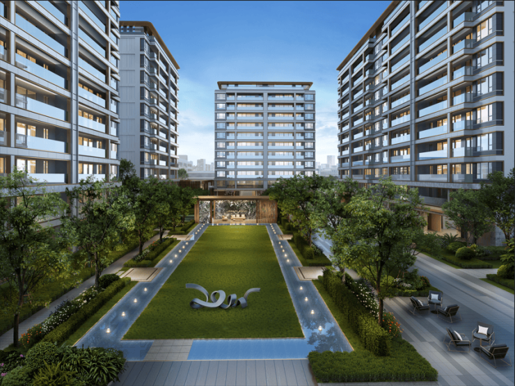 以一环两轴·双中庭·三花园·多架空场景为设计理念,书写尊崇归家场景。半围合式的布局造就最大约130米奢阔楼间距,南北两大中庭空间,东西向尺度开阔,视野无遮挡。