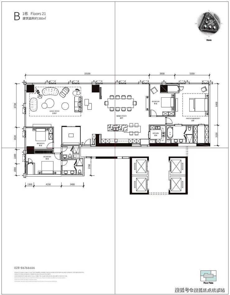 B户型:19米奢华开间、约7米超深进深、270º湖滨视野、四室三厅三卫双厨