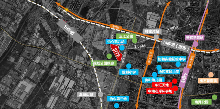 双轨交汇:地铁19号线(温江山站1.4km)、5号线(警官学院站2.3km)