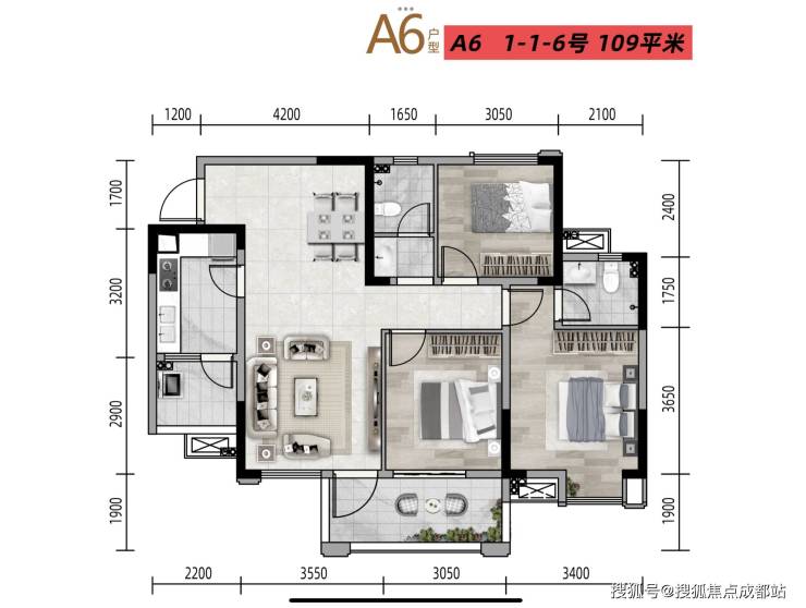 A6户型 建筑面积约109㎡三室两厅两卫