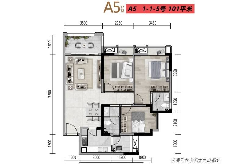 A3/A5户型 建筑面积约101㎡三室两厅两卫
