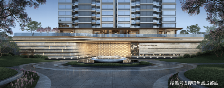 以锦江水流灵感,萃取蜀锦华贵底蕴,打造流线外立面+香槟金线条,呈现精奢立面