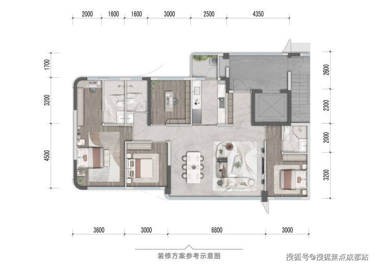 布局亮点:采用端厅设计,客餐厅三面采光,搭配6.8米开间全景阳台,主卧套房含独立衣帽间与明卫。