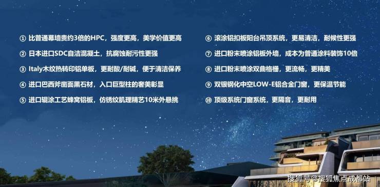 1. 首批32席限量发售2. 独院产品重归市场3. 户户配备独立花园、车位及泳池预留4. 三层全明设计5. 超高得房率:157㎡实得283㎡起6. 162-424㎡私属花园7. 主力层高3.65米,面宽13.5-20米8. 标志性建筑立面9. 天府新区黄金区位10. 高端圈层聚集11. 抗跌保值典范12. 六项国际大奖认证