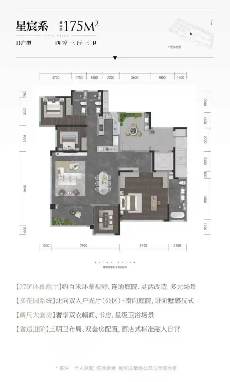 创新三阳台布局,主卧配备独立观景阳台。预留书房空间与超大衣帽间,打造奢华主卧套系。整体空间规划彰显匠心,主卧电视位布局别具巧思。