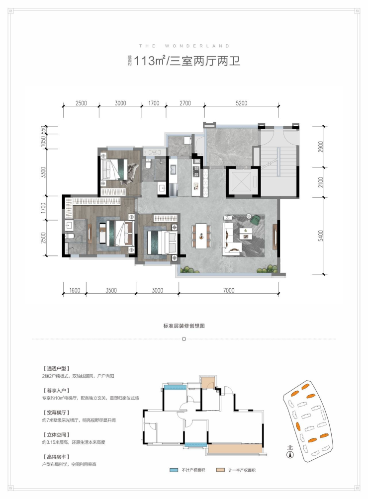 ①区域天花板级别的层高(约3.1-3.15m):远高于市场平均水平(约2.9-3m),其中建面约108㎡户型层高约3.1m,建面约113㎡户型及建面约132㎡户型层高约3.15m。
